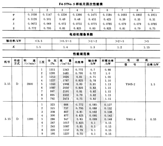F4-57系列風(fēng)機(jī)性能范圍:流量為:666m3/h-5524m3/h;全壓為195Pa-1044Pa。