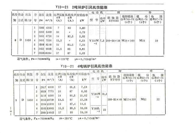 Y10-21型鍋爐離心風機是為適應燃用各種煤質并配有消煙除塵裝置的(1、2、4T/H)工業(yè)鍋爐配套。凡進氣條件相當,性能又相適應者均可選用。但最高溫度不得超過250°C,且在引風機前必須加裝效率不低于85%的除塵裝置,以降低進入風機的煙氣含塵量,提高風機壽命。